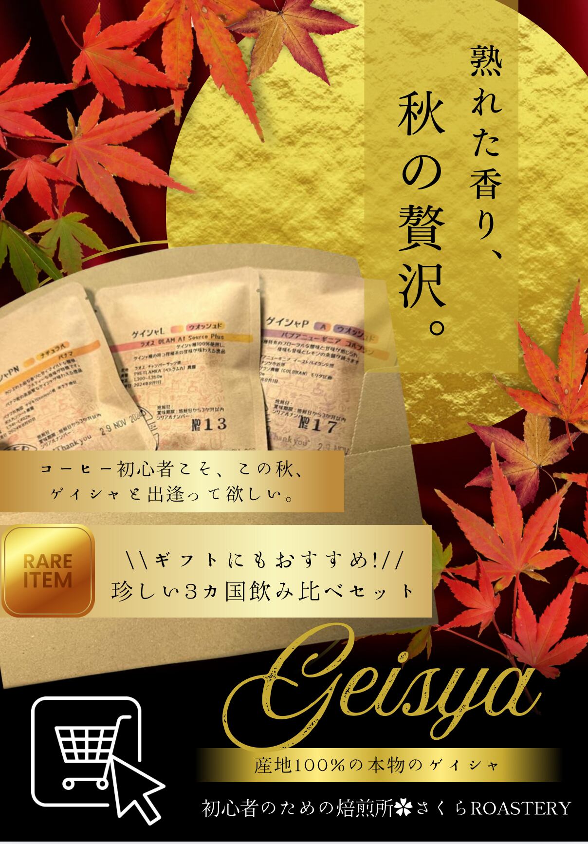 - 各コーヒーは厳選されたゲイシャ3種類(パナマ、ラオス、パプアニューギニア)をご用意しています。